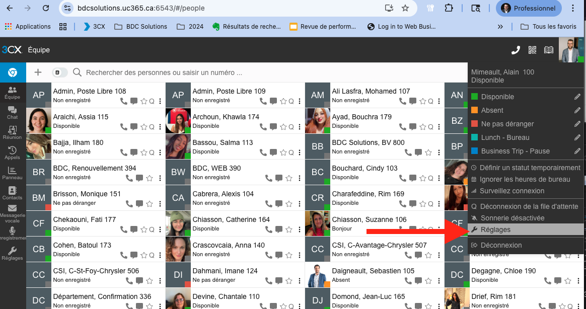 Dans le Web Client 3CX, cliquer sur l’icône ⚙️ Paramètres (en haut à droite)